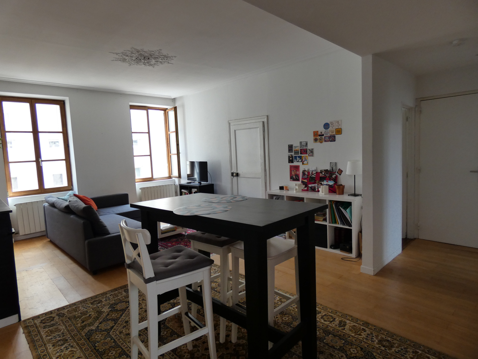 Appartement de 3 pièces au 2ème étage avec moulures et parquet offrant une entrée, un grand séjour lumineux avec cuisine équipée moderne, 2 chambres et une salle de douche.