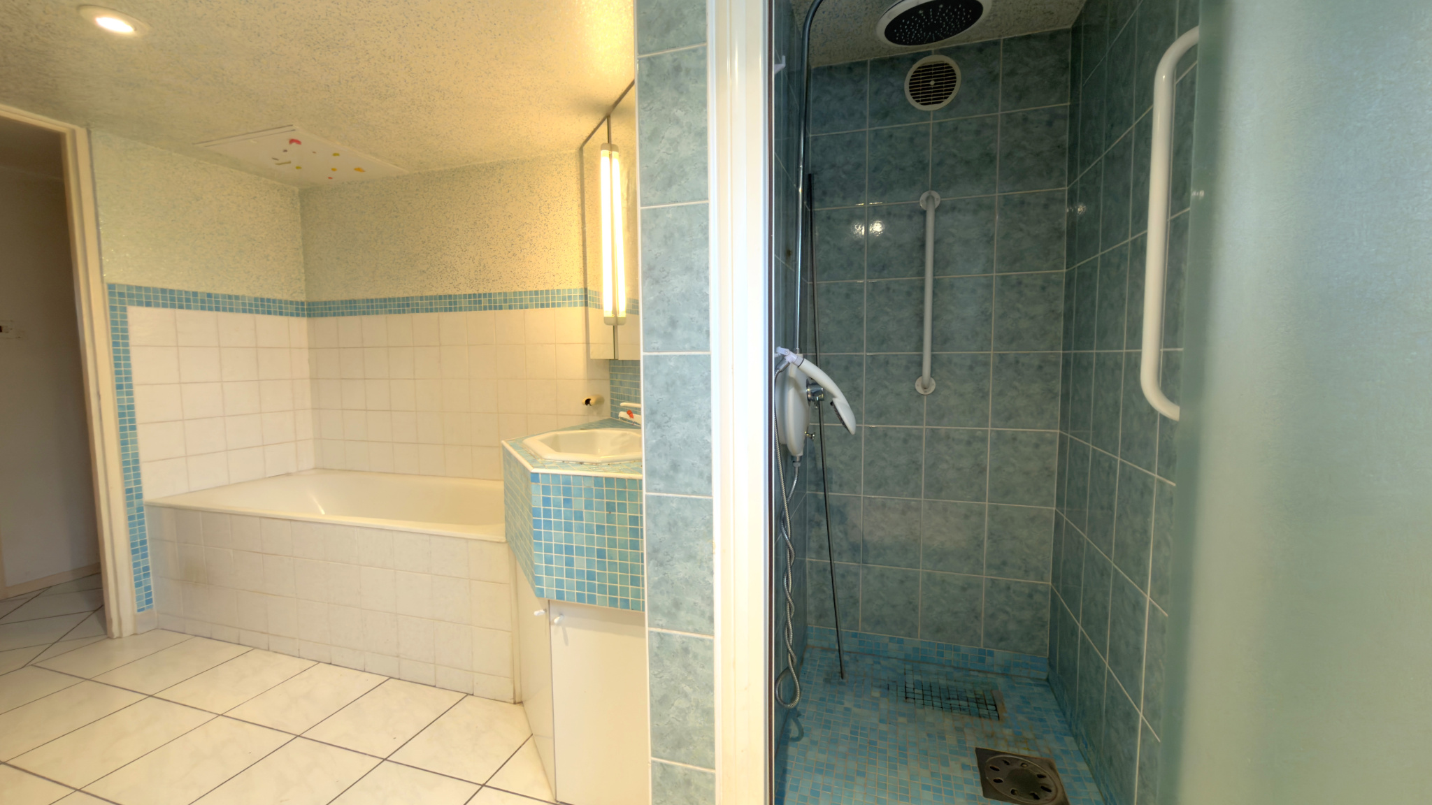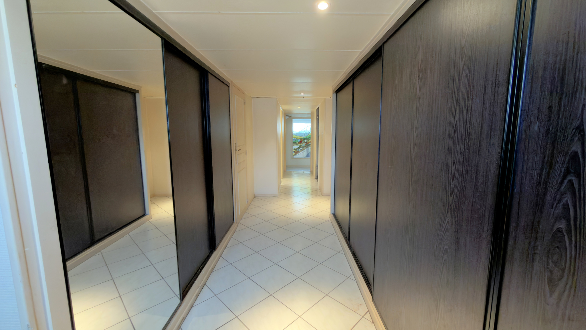 Le rez-de-chaussée propose un couloir avec beaucoup de rangements, deux chambres, une salle de bains avec une douche et un WC, une buanderie ainsi qu’un garage.
